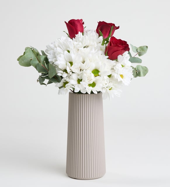 Bej çizgili vazoda papatya ve gül aranjmanı