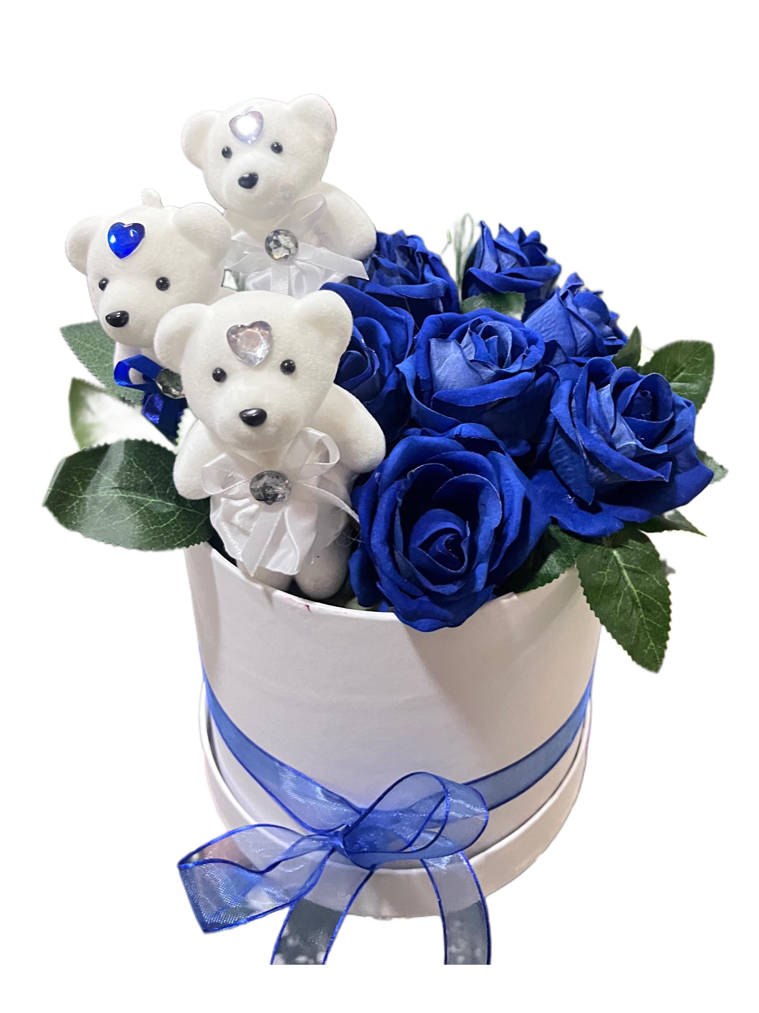 Kutuda yapay mavi gül ve ayıcık aranjmanı