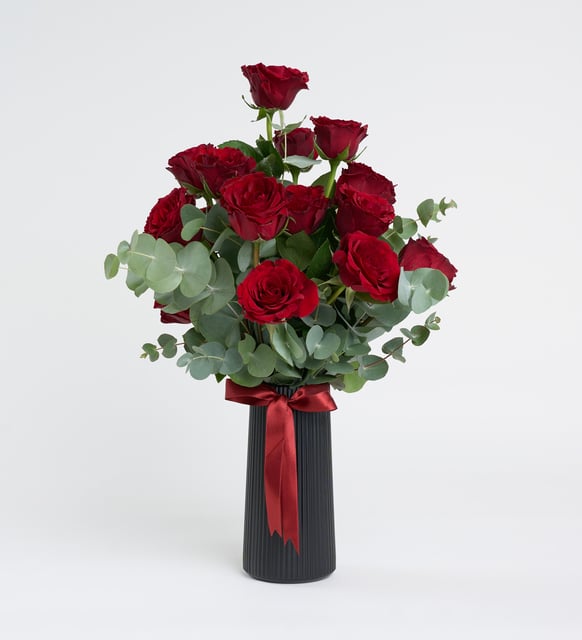 Yeşil çizgili vazoda 3 kırmızı gül ve papatyalar