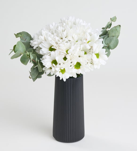 Siyah çizgili vazoda pembe gelberalar ve papatyalar