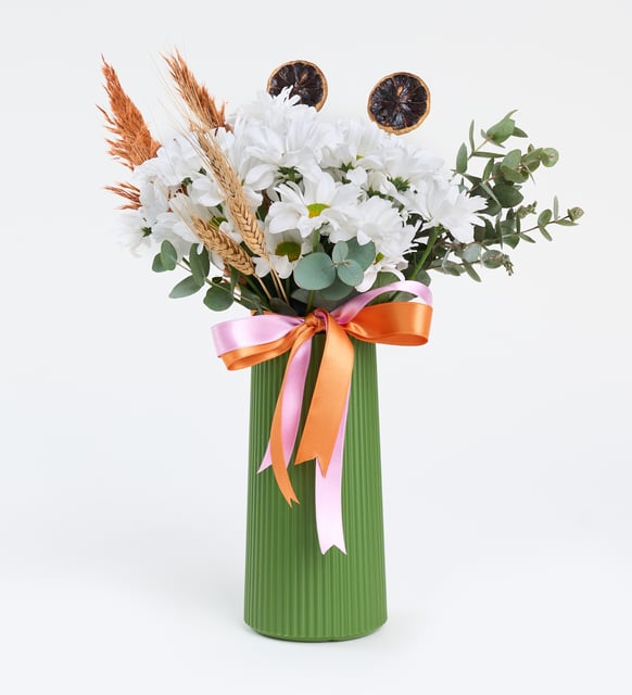 Yeşil çizgili vazoda papatya aranjmanı